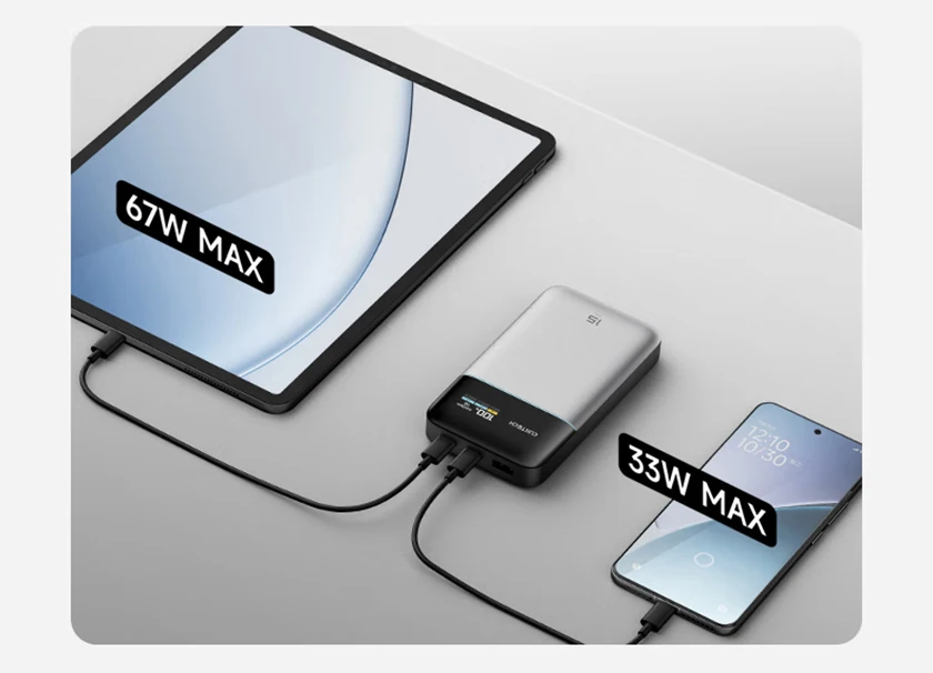 - Đa cổng kết nối: USB-C và USB-A, hỗ trợ sạc đồng thời nhiều thiết bị.